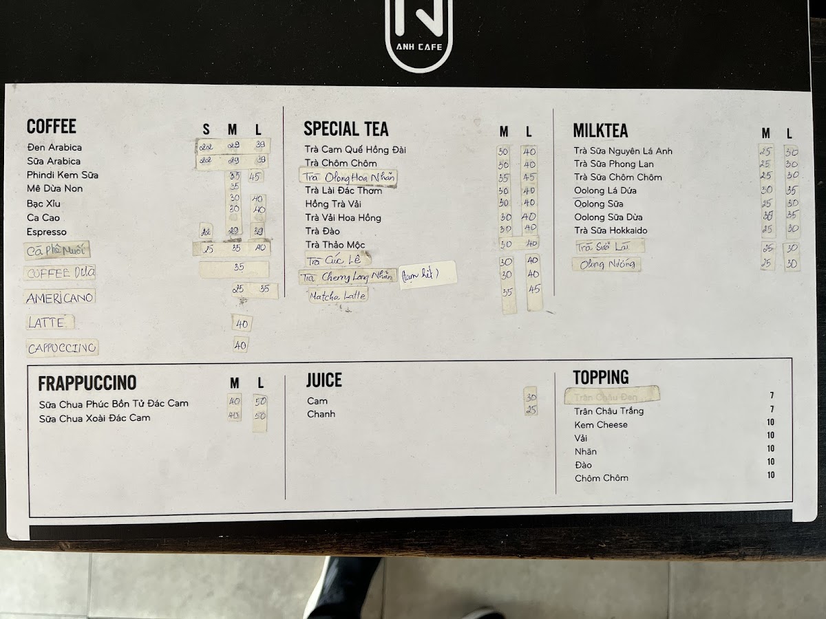 ANH Cafe's menu boasts a delightful range of beverages. Customers rave about the fresh orange juice, priced affordably at 40,000 VND, and the refreshing mango tea, highly recommended for its vibrant flavors. Many patrons appreciate the polite staff who generously offer recommendations, ensuring a pleasant experience.